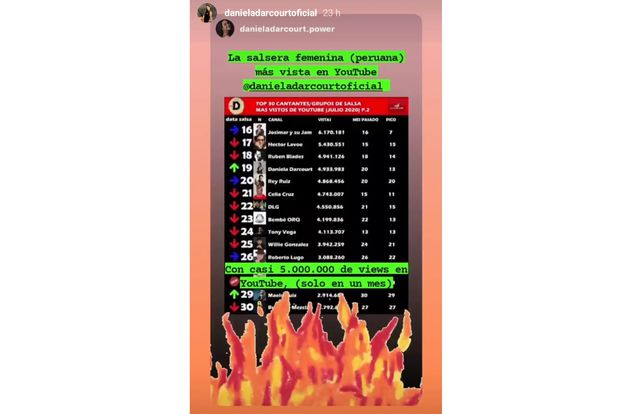 «La salsera femenina (peruana) más vista en YouTube. Con casi 5 millones de views (reproducciones) en YouTube (solo en un mes)», se puede leer en la publicación que compartió Danielal Darcourt en su cuenta de Instagram.