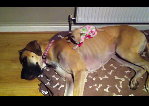 Este pequeño Chihuahua encontró su cama perfecta en el vientre de un Gran Danés.