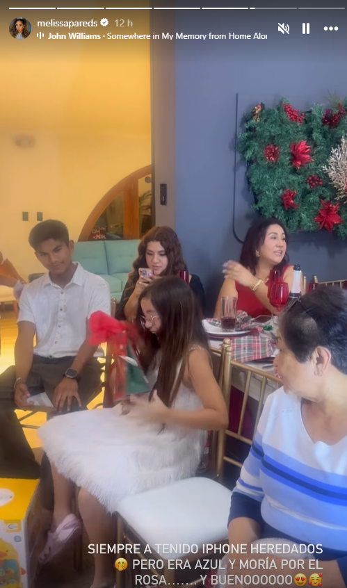 Finalmente, Melissa Paredes mostró parte de su celebración navideña a través de sus historias de Instagram. La actriz pasó la Nochebuena acompañada de su familia y de su esposo, Anthony Aranda. Uno de los momentos más emotivos fue cuando su hija abrió uno de sus regalos y descubrió que se trataba de un iPhone 15 de color rosa.