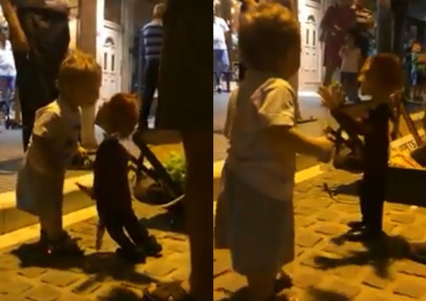 Un niño de aproximadamente 2 años de edad estuvo paseando por la calle junto a sus padres cuando de pronto se dieron cuenta que un show de títeres estaba en medio de la pista. Los papás no dudaron en acercar al pequeño para ver su reacción y cuando lo hicieron grabaron el momento en el que ambos se conocían.