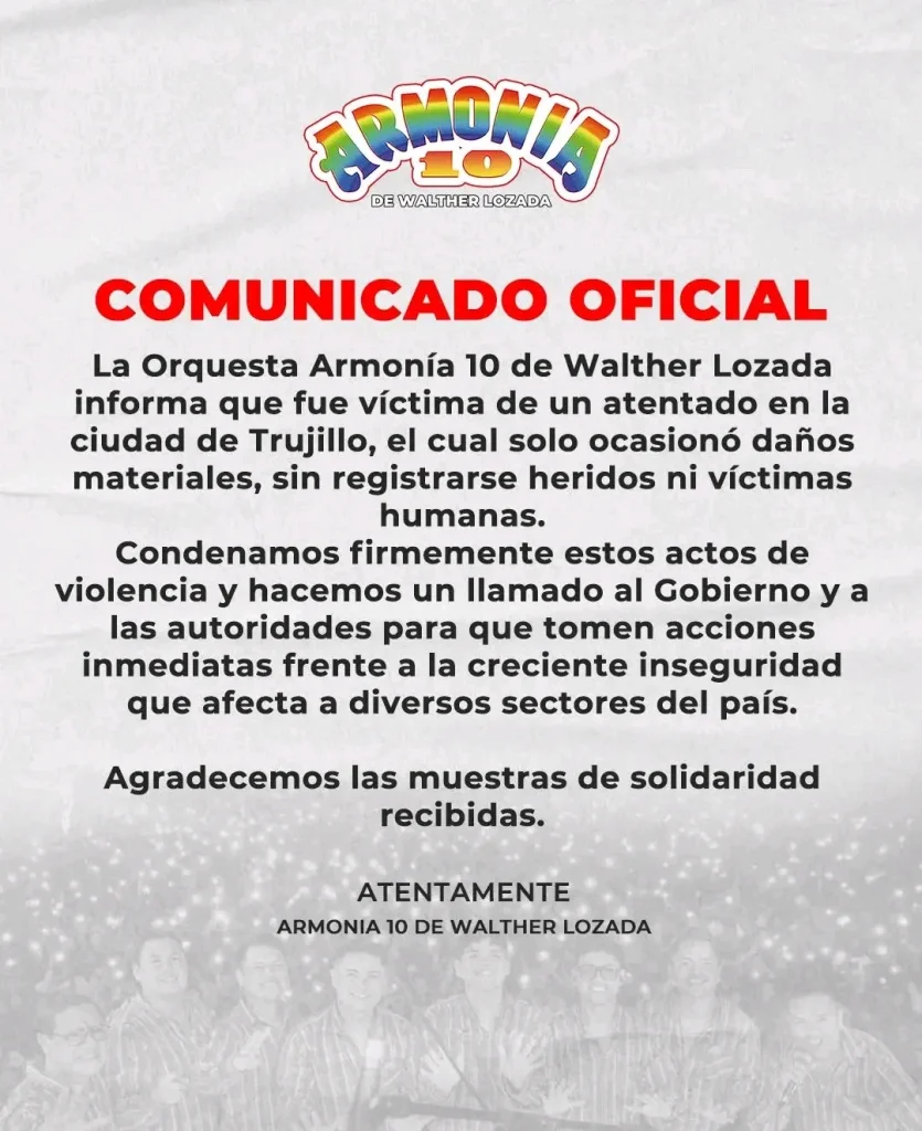 “La orquesta Armonía 10 de Walther Lozada informa que fue víctima de un atentado en la ciudad de Trujillo, el cual solo ocasionó daños materiales, sin registrarse heridos ni víctimas humanas”, detalla el pronunciamiento.