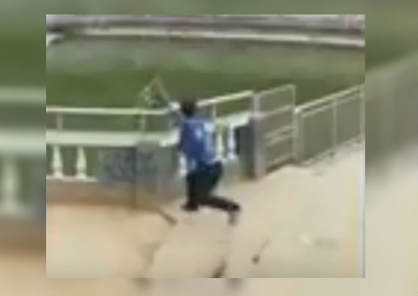 El joven corre para que no lo alcance pero poco antes que termine el video se ve a otro simio acercándose a la escena queriendo buscar al hombre que empujó a su amigo.